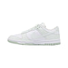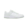 Women's Nike Dunk Low Next Nature 'White Mint' features a pastel two-tone palette and a sustainable build made of at least 20% recycled materials. White synthetic leather uppers are complemented by pale mint green overlays on the forefoot and heel. The woven tongue tag and leather heel tab are adorned with Nike branding, while the Volt-colored mesh sockliner bears the iconic pinwheel logo.